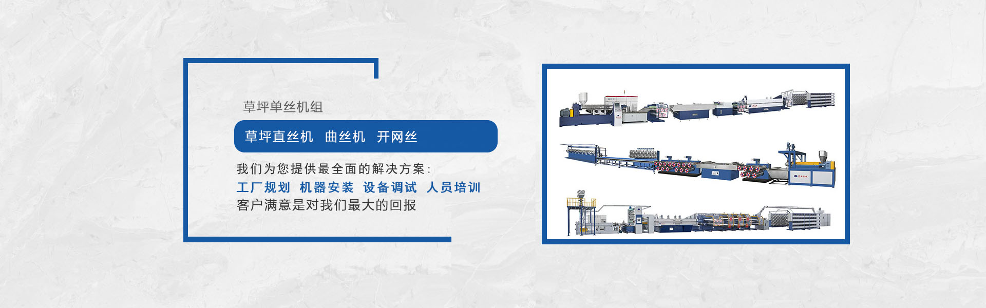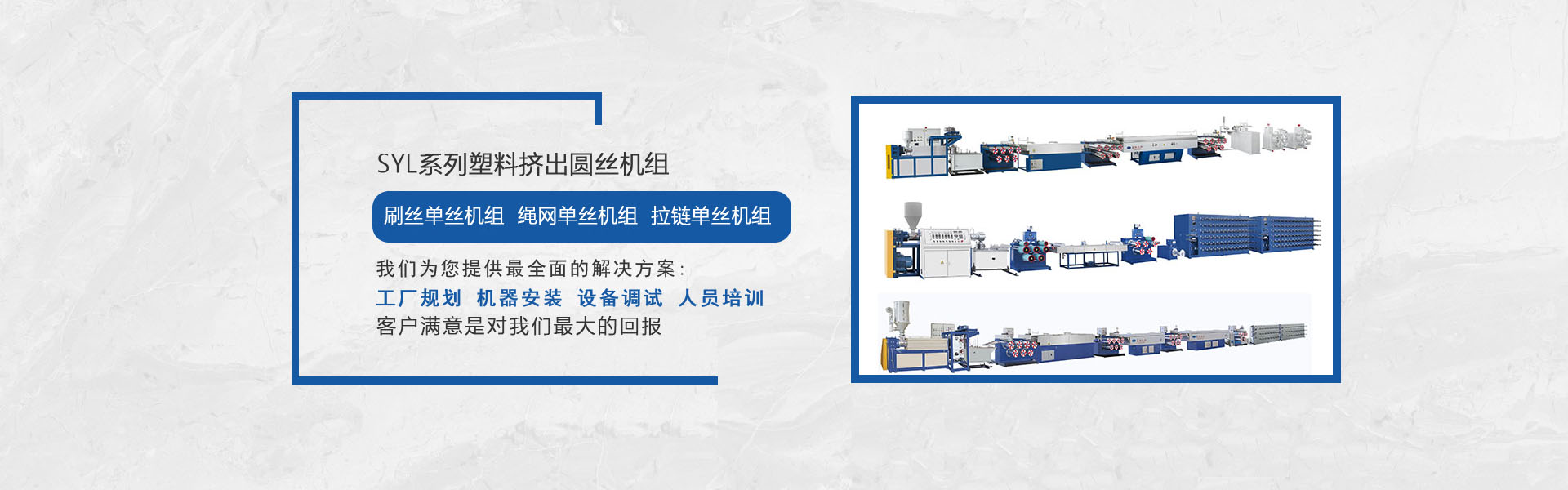 我司是專業(yè)生產塑料擠出圓絲、平膜扁絲機組等及其聚酯托幕線等配套附件、部件的專業(yè)化、正規(guī)化的企業(yè),公司集行業(yè)專家的豐富知識,多年積累的經(jīng)驗,結合國外同行先進技術,研發(fā)制造出系列圓絲擠出機組,在主要技術指標和性能上已處領先水平,我們正不斷優(yōu)化管理,強化細節(jié),使之能更好地為廣大用戶提供從技術、制造到工藝的全方位服務。